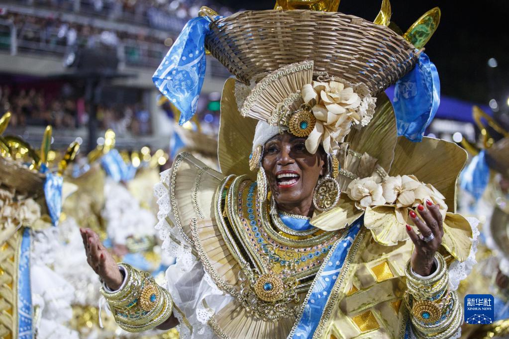 2月21日凌晨,在巴西里約熱內盧桑巴大道,一名桑巴舞校演員參加狂歡節游行。