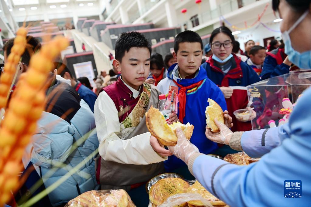 2月21日,在西安市浐灞第一中學舉行的藏歷新年團拜活動上,漢藏學生品嘗特色小吃。