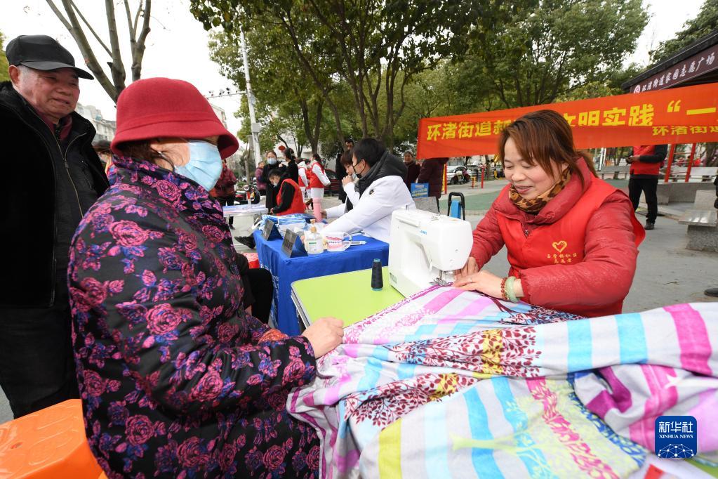 2月22日,浙江省湖州市,縫紉店主王新妹(前右)在志愿服務站為市民周月華(前左)縫制新被套。