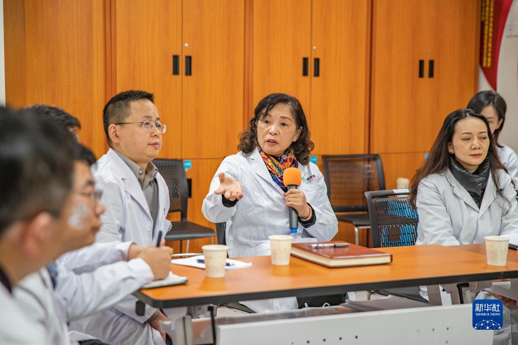 2月16日,在重慶醫科大學附屬兒童醫院兩江院區,李秋(中)與腎臟內科的醫護人員交流時發言。