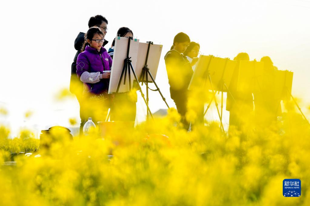 隨著天氣回暖,江西省樟樹市永泰鎮官湖村的油菜花競相綻放,金黃色花海染盡鄉野,吸引了眾多游人和學生等前來觀賞、寫生,感受春日之美。