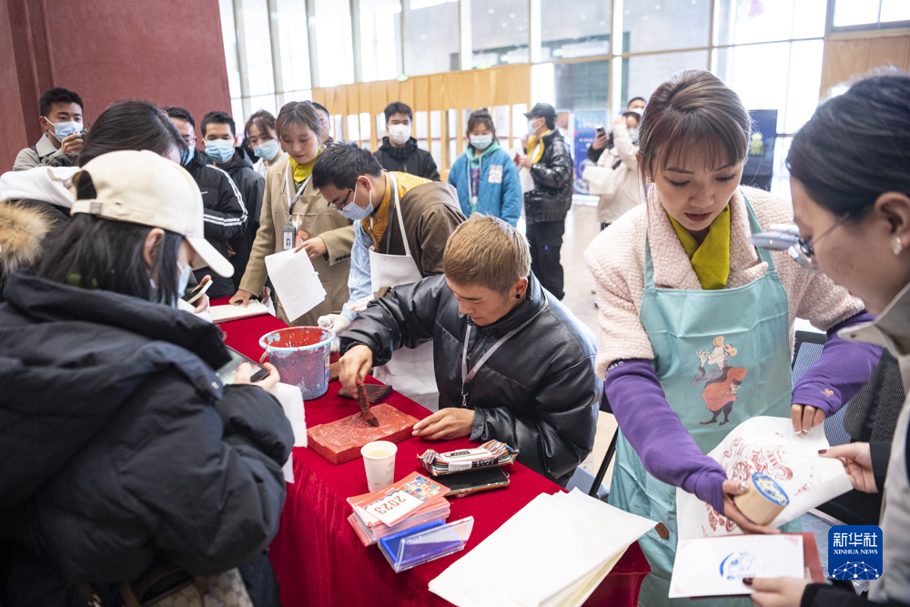 2月22日,西藏博物館工作人員為游客制作帶有“吉祥八寶”“扎西德勒”等圖案和文字的木刻印刷品。