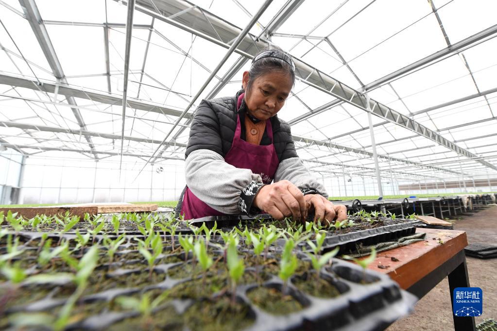 2月22日,在貴州省榕江縣車江壩區育苗大棚里,農民在管護作物幼苗。