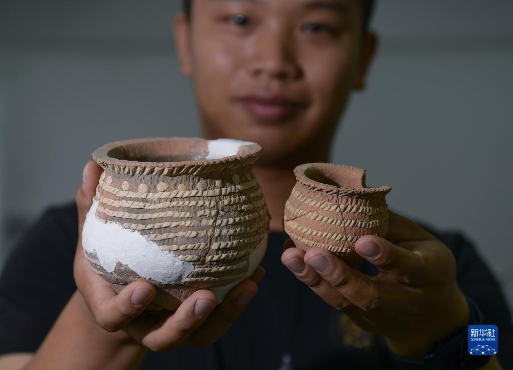 考古工作人員展示甘肅慶陽市南佐新石器時代遺址內出土的箍白泥附加堆紋夾砂陶罐(2022年8月25日攝)。