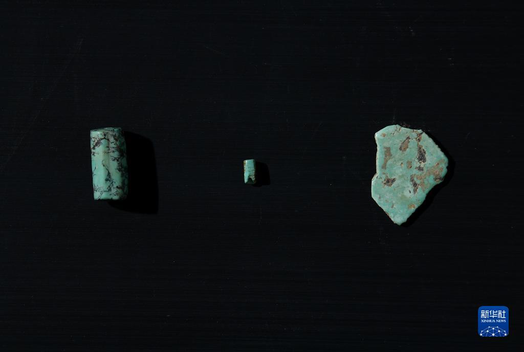 甘肅慶陽市南佐新石器時代遺址出土的綠松石管與綠松石片(2022年8月25日攝)。