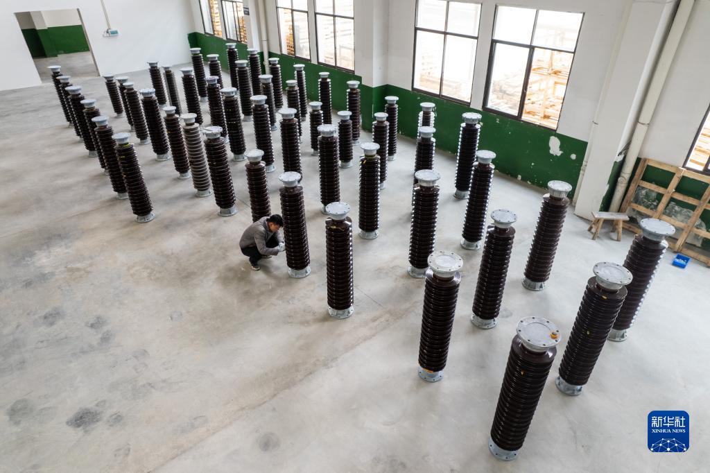 2月22日,在位于醴陵市的湖南陽東電瓷電氣股份有限公司生產車間,工作人員在檢查瓷絕緣子質量(無人機照片)。