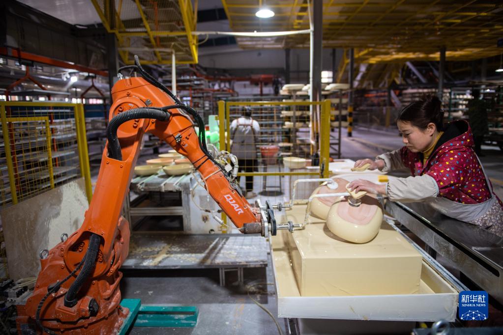 2月22日,在位于醴陵市的湖南華聯溢百利瓷業有限公司生產車間,工作人員在給瓷器上釉。