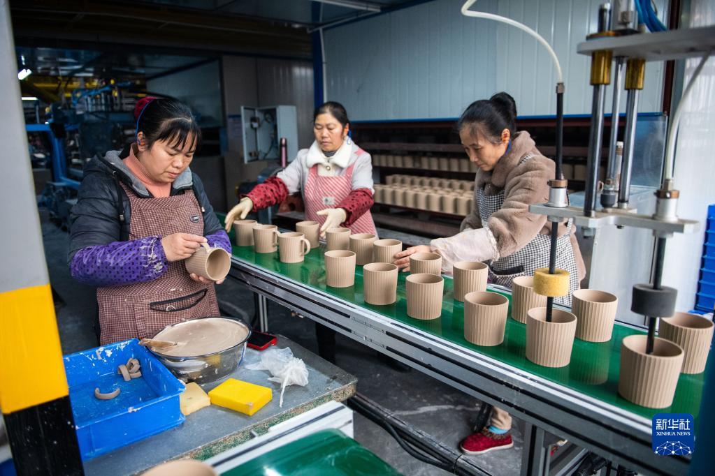 2月22日,在位于醴陵市的湖南華聯溢百利瓷業有限公司生產車間,工作人員在安裝瓷杯握柄。