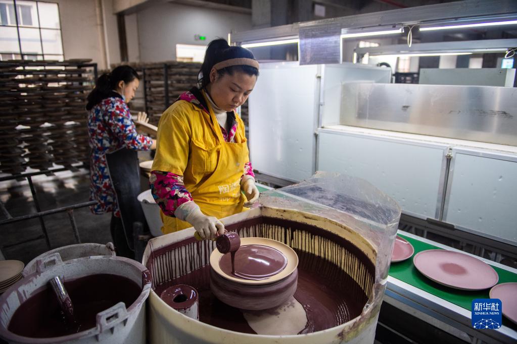 2月22日,在醴陵陶潤實業發展有限公司生產車間,工作人員給瓷器半成品上釉。