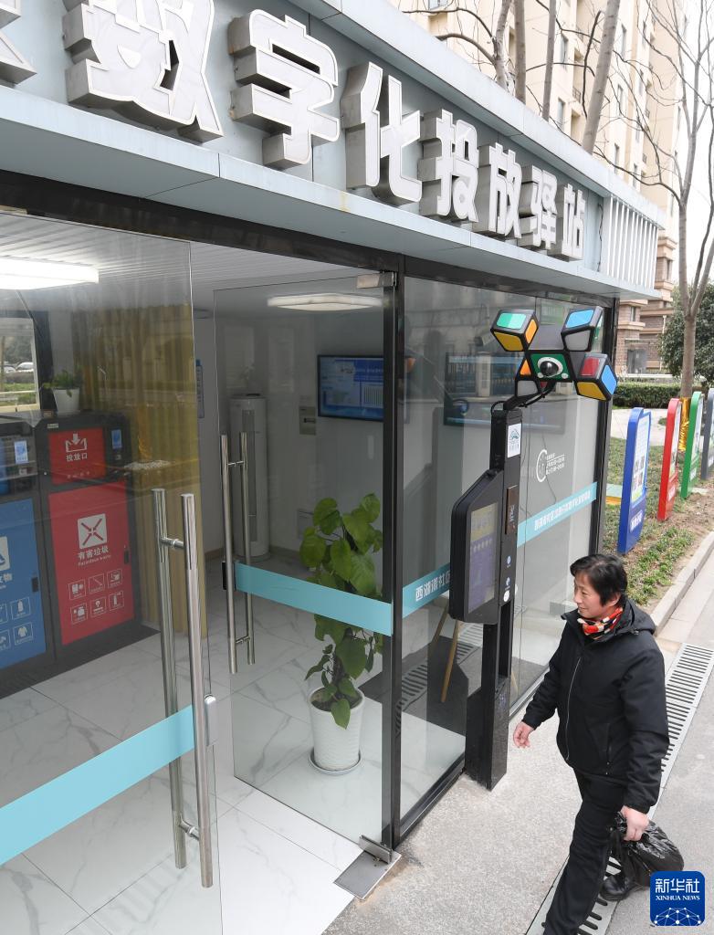 2月22日,在八里店鎮西湖漾社區垃圾分類數字化投放驛站,一位居民前來投放生活垃圾。