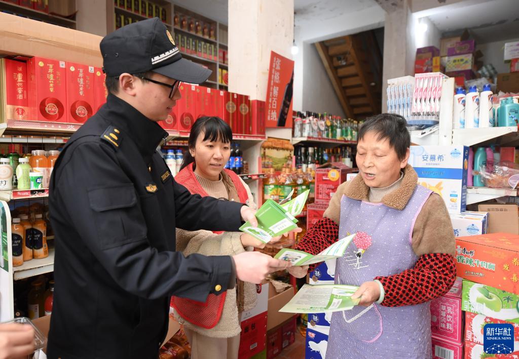 2月22日,在八里店鎮西山社區,黨員志愿者和行政執法隊員向沿街商戶發放垃圾分類、沿街清運的告知單。