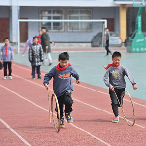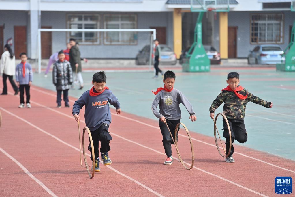 2月22日,廣西蒙山縣夏宜民族學校學生在體育課上滾竹環。