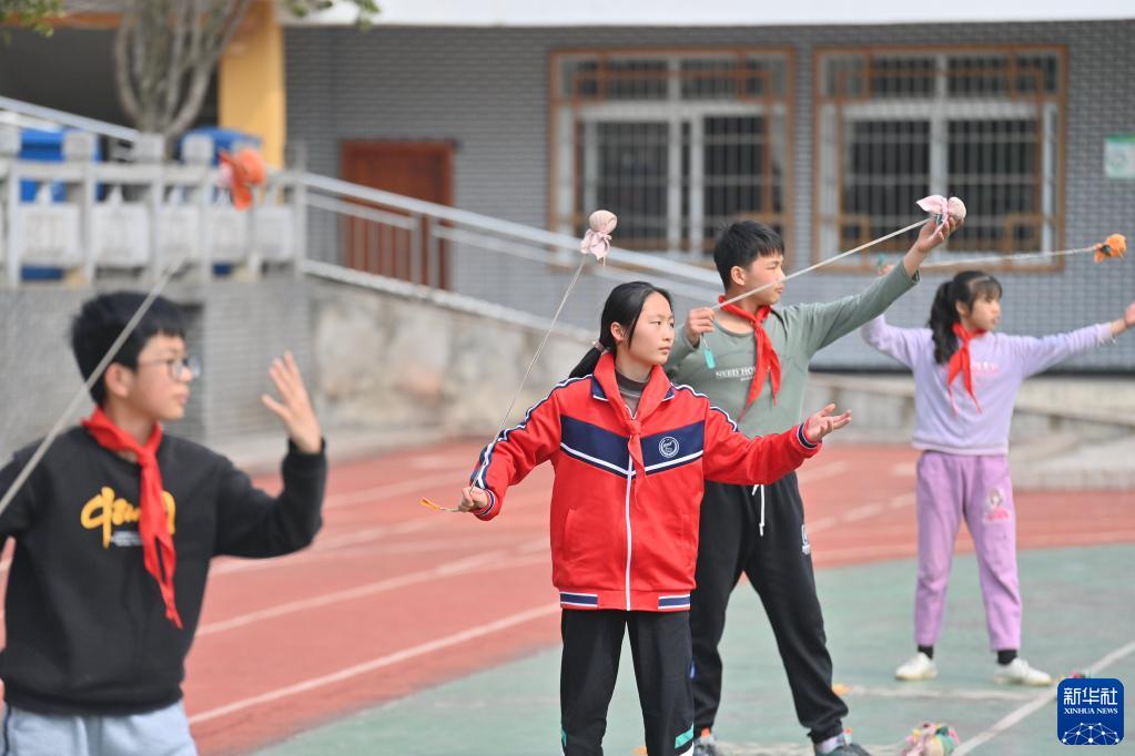 2月22日,廣西蒙山縣夏宜民族學校學生在體育課上練習拋繡球。