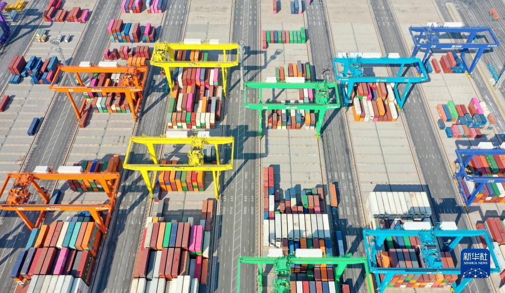 在天津港全物聯網集裝箱碼頭,場橋在堆場內吊運集裝箱(無人機照片,2月21日攝)。