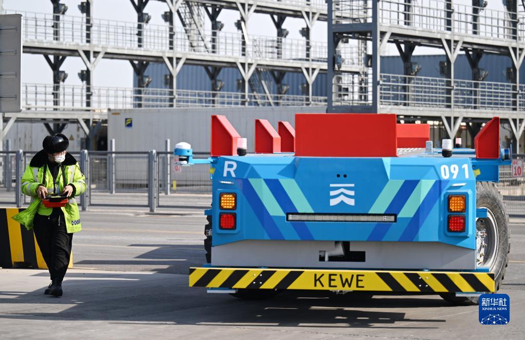 工作人員在天津港全物聯網集裝箱碼頭調試智能水平運輸機器人(2月21日攝)。