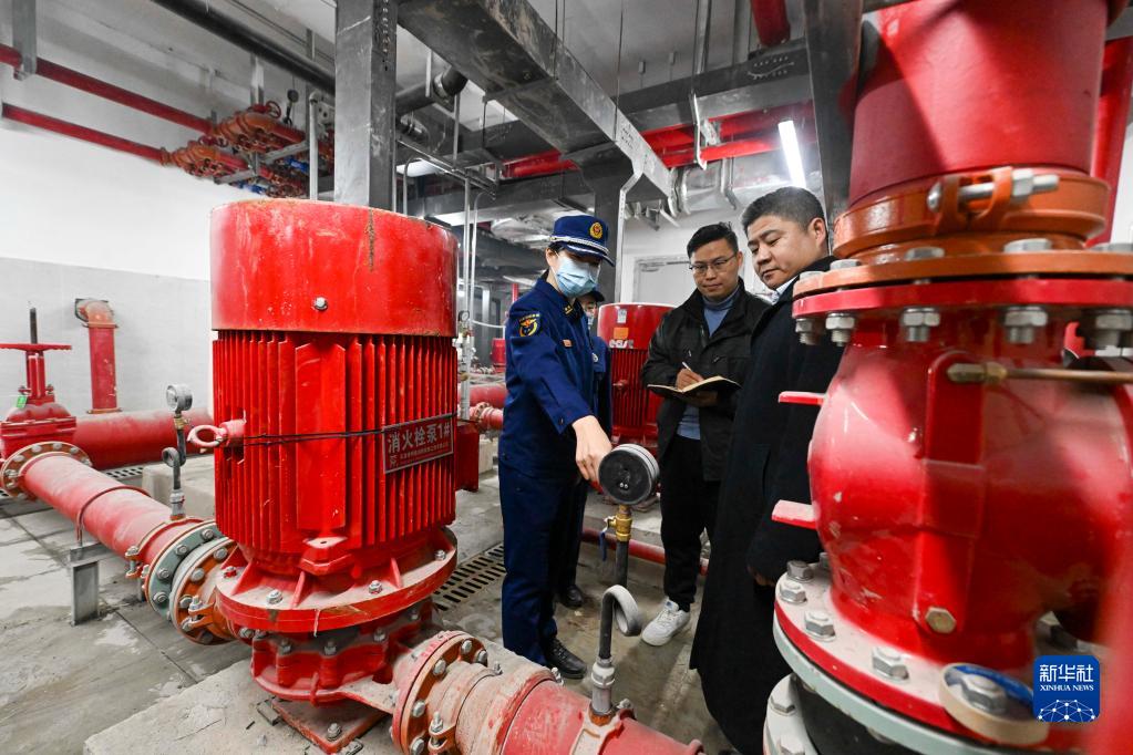 2月22日,在天津市河西區中海環宇城購物中心,天津市河西區消防救援支隊聯合物業工作人員檢查消防栓泵房安全運營情況。