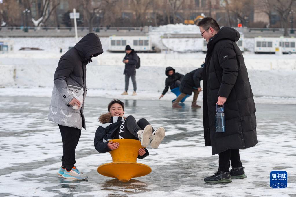 2月22日,游客在哈爾濱松花江冰雪嘉年華園區內游玩。