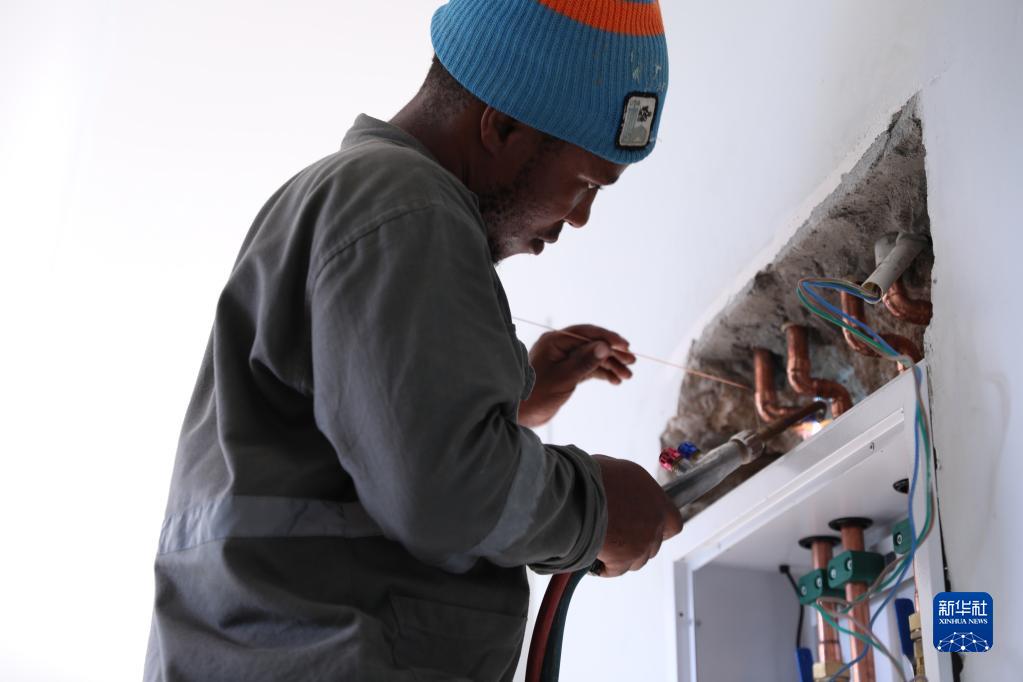 2月21日,工人在坦桑尼亞桑給巴爾島姆布茲尼地區醫院安裝醫用氧氣相關設施。