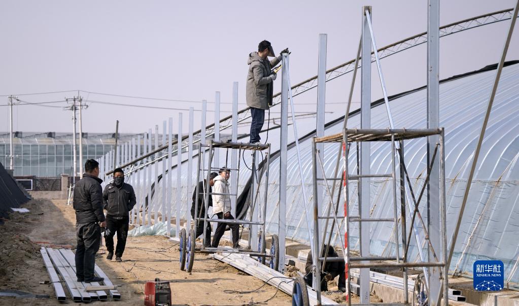 2月22日,工人在北京市大興區龐各莊鎮一家合作社建設現代化農業大棚。