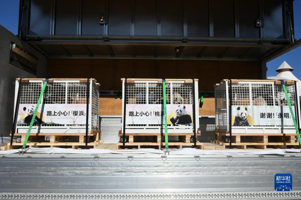 2月22日,在日本和歌山縣白浜町的“冒險世界”樂園,三只大熊貓已經裝車準備出發。