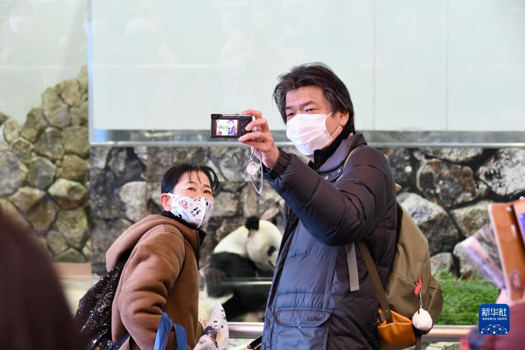 2月21日,在日本和歌山縣白浜町的“冒險世界”樂園,游客拍照留念。