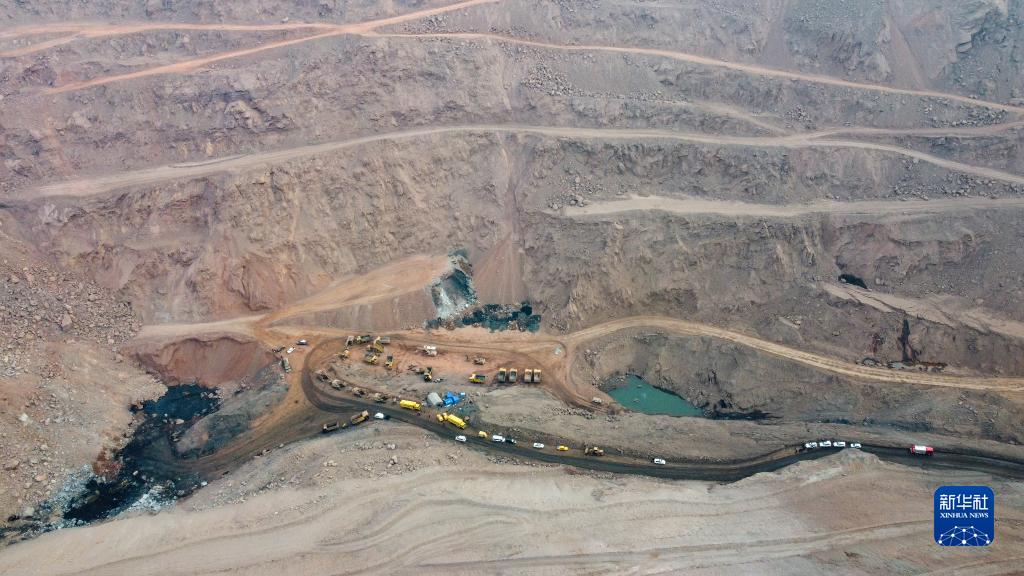 2月23日,救援車輛在內蒙古自治區阿拉善盟阿拉善左旗新井煤業有限公司露天煤礦坍塌事故現場作業(無人機照片)。