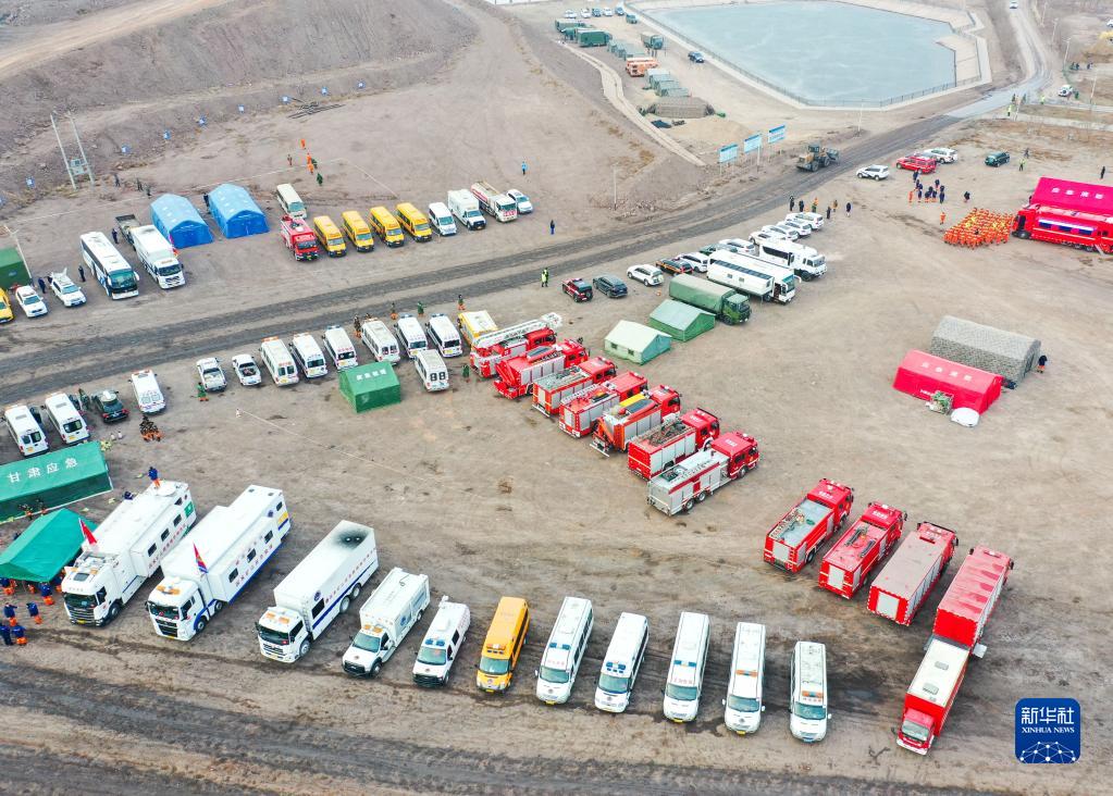 2月23日,救援車輛在內蒙古自治區阿拉善盟阿拉善左旗新井煤業有限公司露天煤礦坍塌事故現場附近待命(無人機照片)。