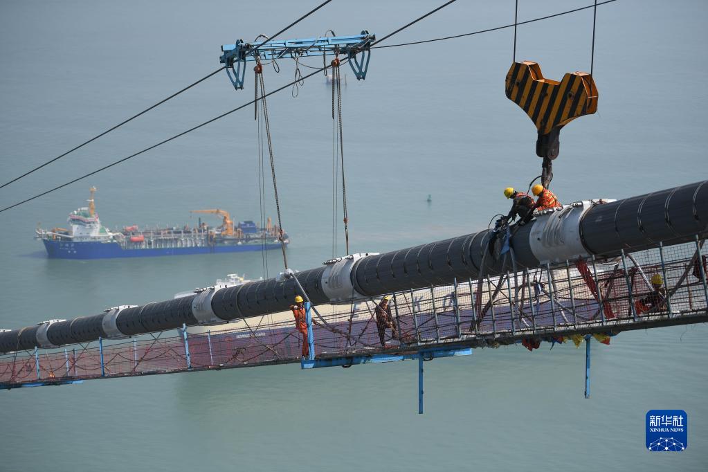 2月22日,工人在深中通道伶仃洋大橋海上施工貓道及主纜上開展作業。
