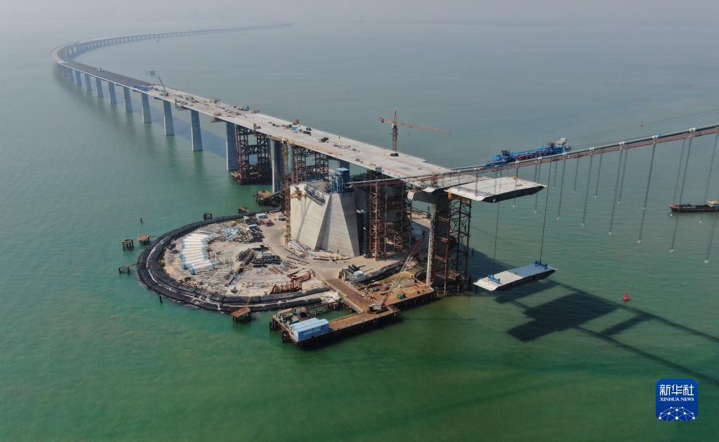 這是2月22日拍攝的正在吊裝鋼箱梁的深中通道伶仃洋大橋邊跨(無人機照片)。