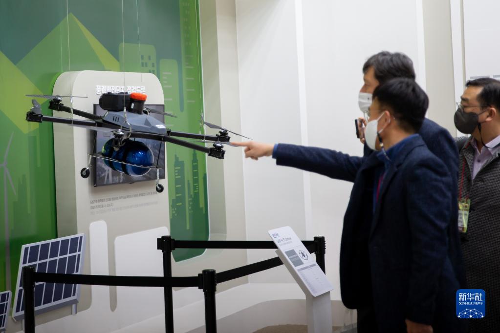 2月23日,參觀者在韓國釜山舉辦的2023韓國無人機展上觀看液化氫燃料無人機。