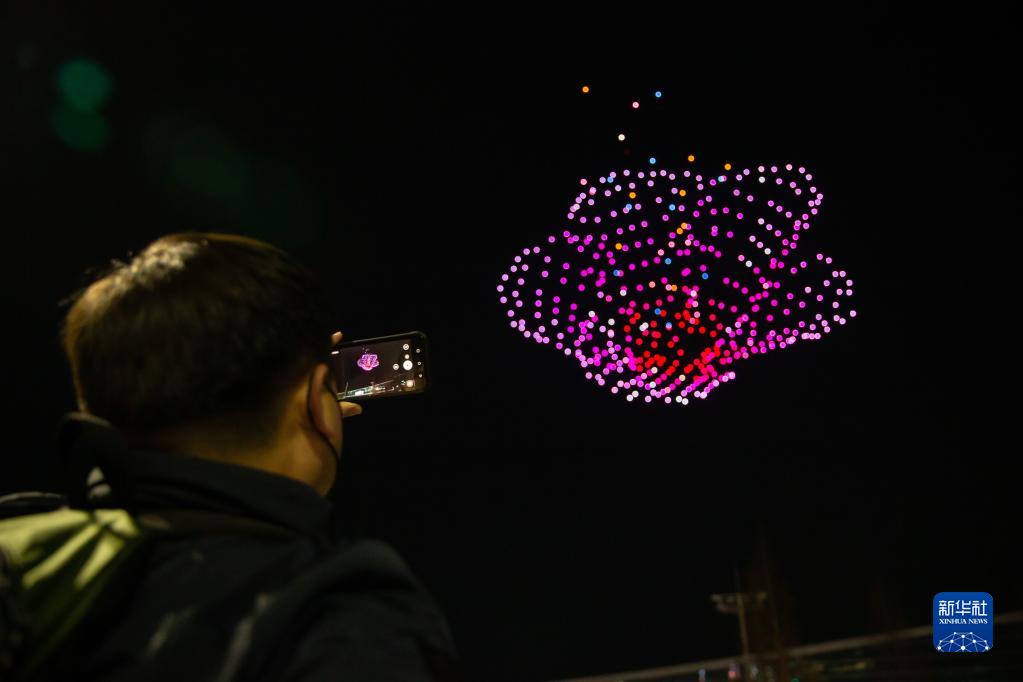 2月23日,參觀者在韓國釜山用手機拍攝2023韓國無人機展上的無人機燈光表演。