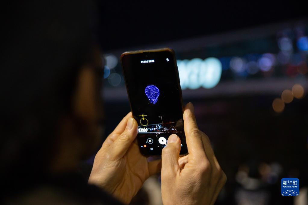 2月23日,參觀者在韓國釜山用手機拍攝2023韓國無人機展上的無人機燈光表演。