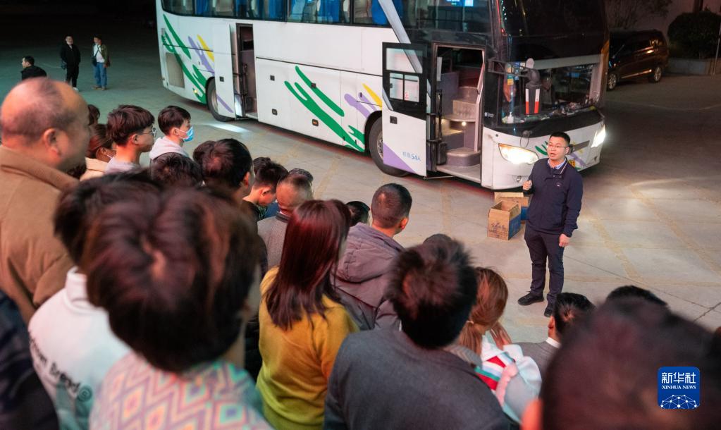 在云南省曲靖市麒麟區人力資源服務產業園內,袁海波給準備出發的務工人員加油鼓勁(2月12日攝)。