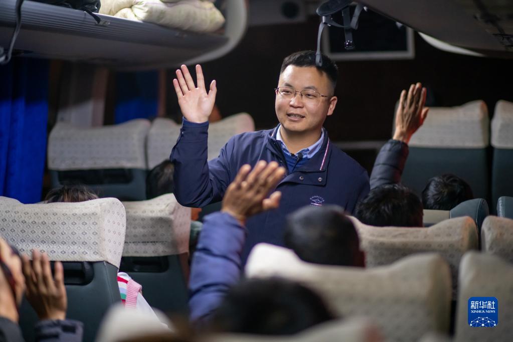 在云南省曲靖市麒麟區人力資源服務產業園內,袁海波與準備出發的務工人員道別(2月12日攝)。