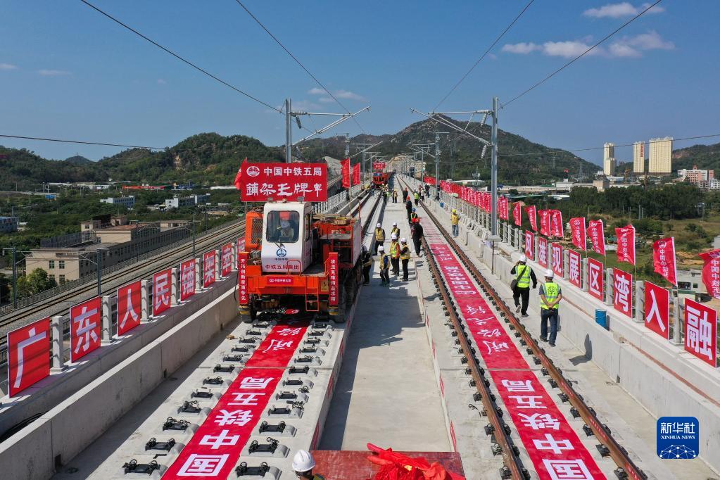 當日,中鐵五局承建的廣汕鐵路正線最后一組500米長軌在汕尾東沖特大橋鋪設完成,該線正線鋪軌實現貫通。廣汕鐵路是“軌道上的大灣區”高鐵骨干網重要組成部分,該線全長202公里,時速350公里,途經廣州、惠州、深汕特別合作區、汕尾。全線通車后,廣州到汕尾運行時間將縮短至1小時以內。