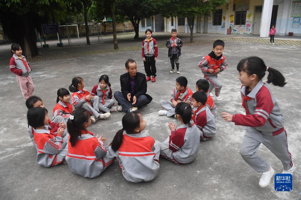 在廣西賓陽縣王靈鎮中心學校七新教學點,王英紅老師課間和學生做游戲(2月22日攝)。