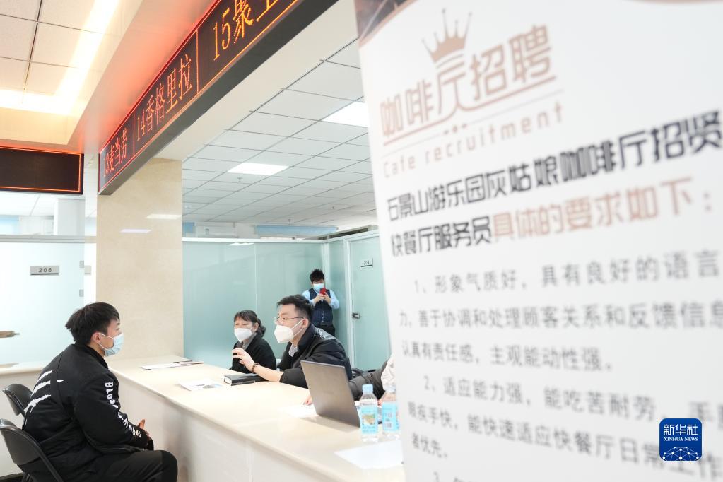 在北京市石景山區人力資源公共服務中心的春風行動酒店餐飲行業招聘專場,一位求職者(左一)與企業招聘人員交流(2月21日攝)。