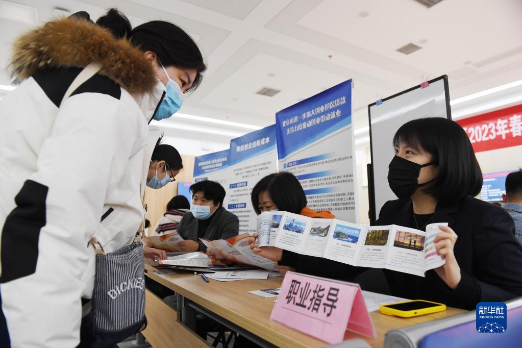 2月23日,北京市西城區2023年春風行動暨就業援助月專場招聘會現場,工作人員向求職者進行就業指導。