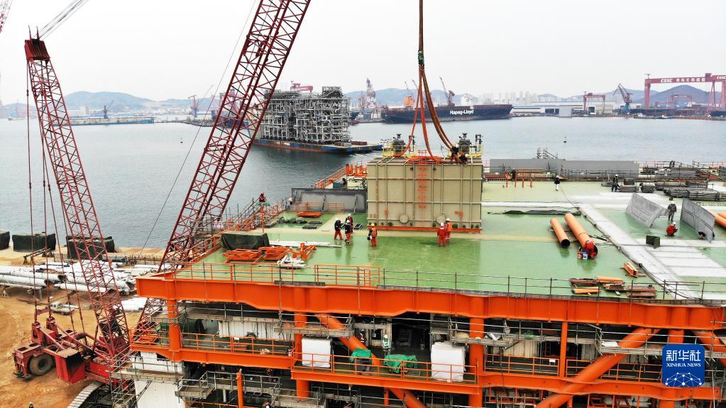 這是正在建造中的渤中19-6凝析氣田一期CEPA(中心處理平臺)組塊(2月22日,無人機照片)。
