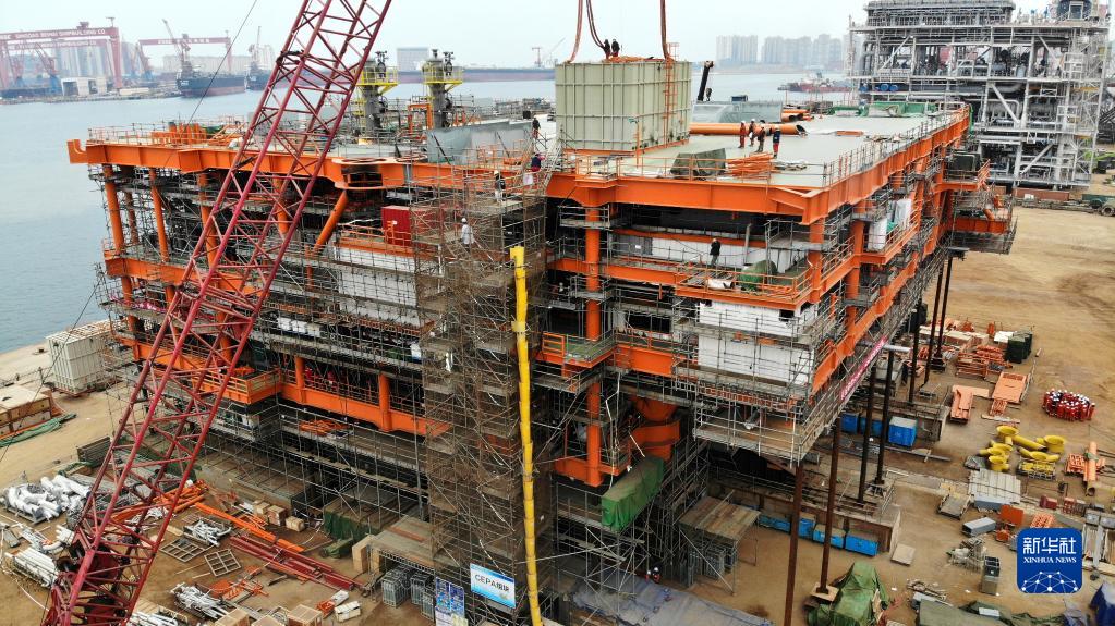 這是正在建造中的渤中19-6凝析氣田一期CEPA(中心處理平臺)組塊(2月22日,無人機照片)。