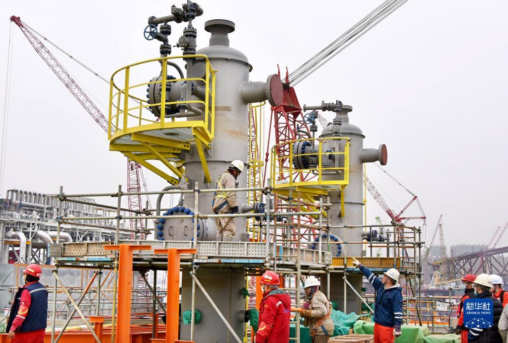 2月22日,工人在渤中19-6凝析氣田一期CEPA(中心處理平臺)組塊建造現場進行安裝作業。