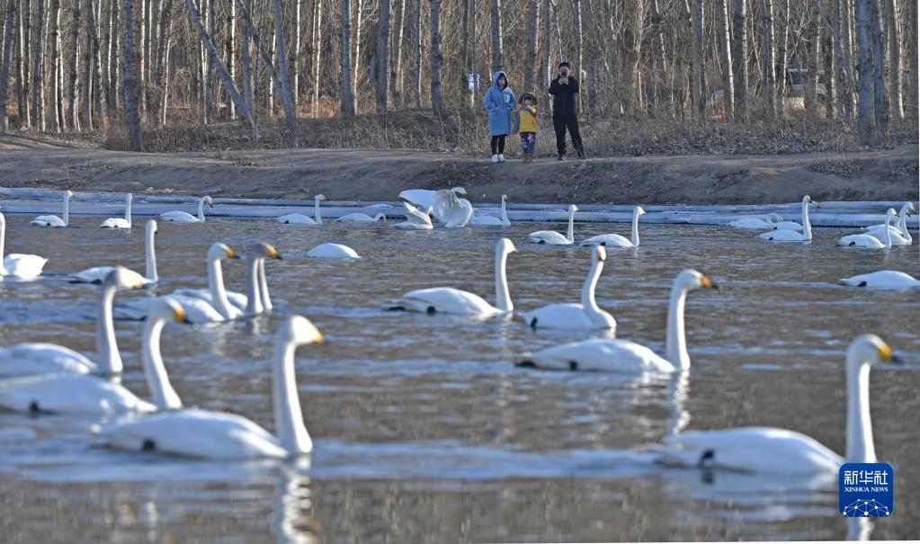 2月21日,游客在北票市八家子鄉紅村大凌河畔觀賞天鵝。