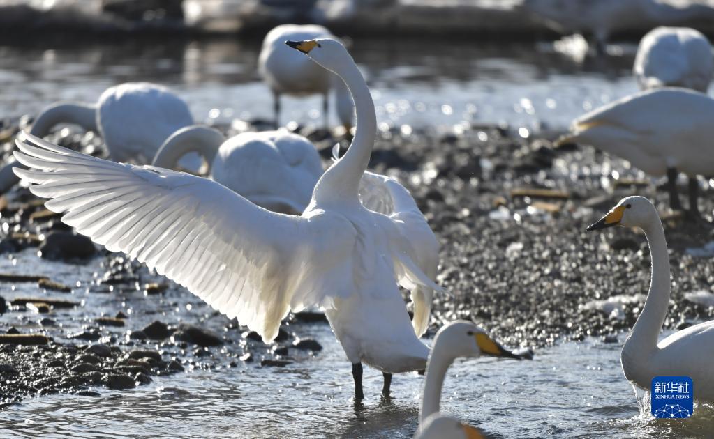 入冬以來,遼寧省北票市八家子鄉紅村大凌河畔的400多只白天鵝在河水淺灘處嬉戲覓食,吸引人們前來觀賞和拍照。