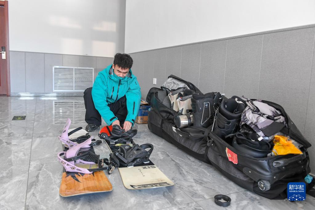 2月22日,吉林市永吉縣北大湖鎮南溝村一家民宿負責人公配成為客人整理雪具。