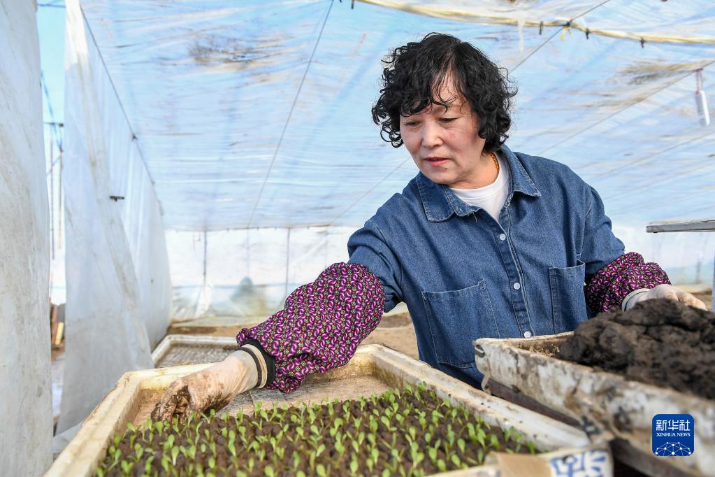 2月22日,農民李玉霞在吉林市永吉縣北大湖鎮五里河村移栽蔬菜苗。