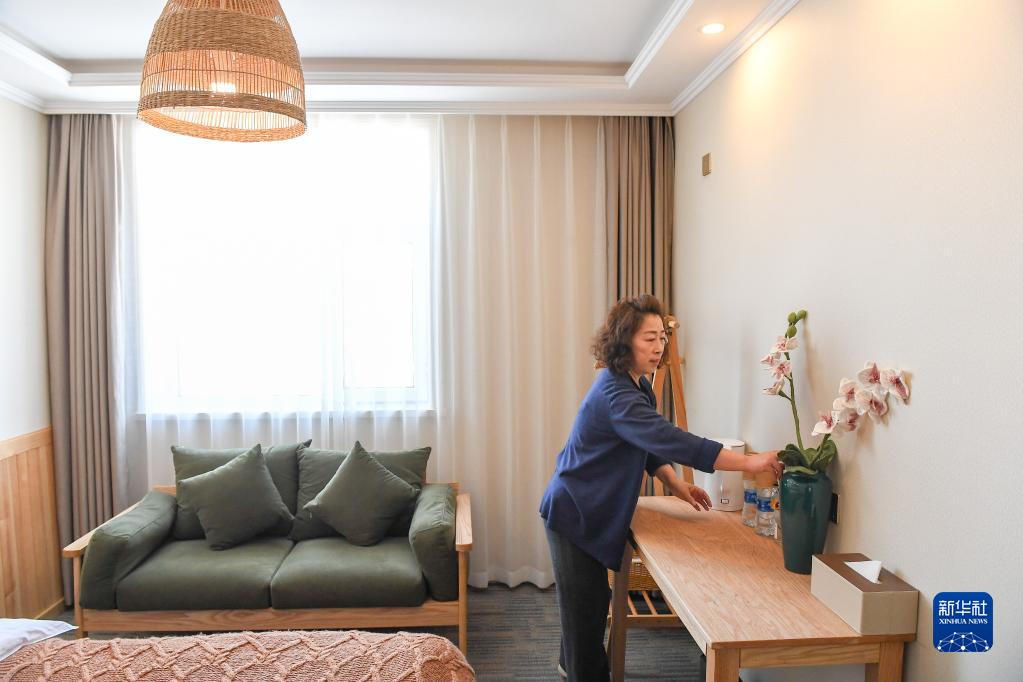2月23日,吉林市永吉縣北大湖鎮五里河村一家民宿工作人員李志英在整理房間。
