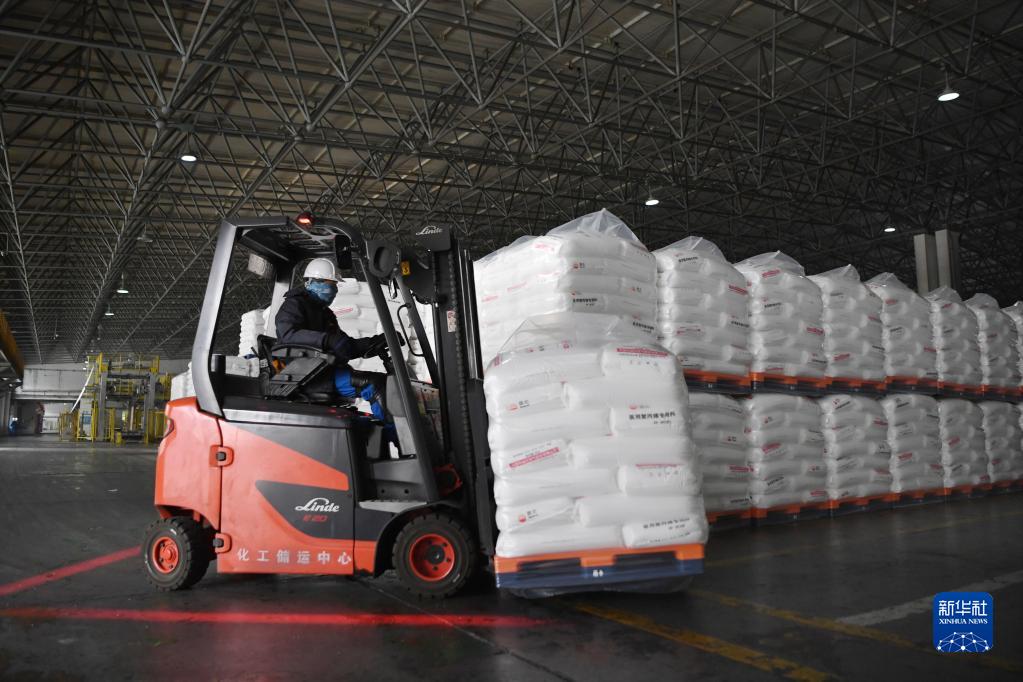 蘭州石化公司化工儲運中心工作人員用叉車進行裝卸作業(2月21日攝)。