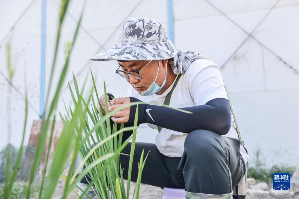 2月22日,青島海水稻研究發展中心的科研人員在海南三亞的國家南繁科研育種基地里做水稻雜交實驗。