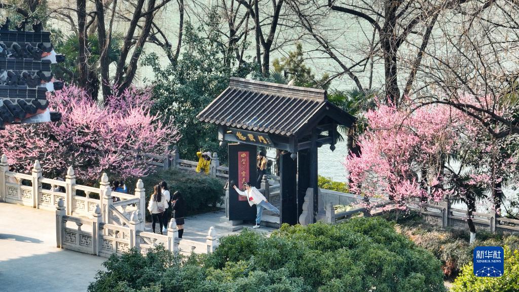 2月20日,市民在安徽省合肥市包公園賞花拍照(無人機照片)。
