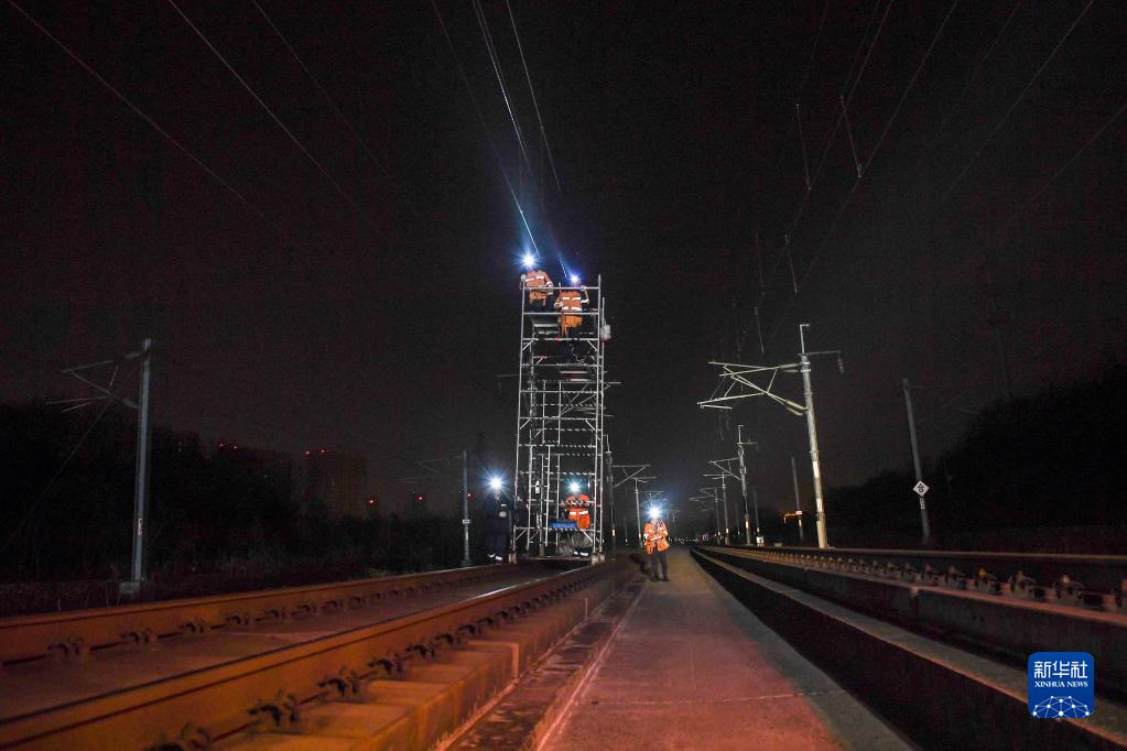 2月23日,綜合維修工在滬寧城際高鐵南京站至仙林站區間對接觸網進行檢修維護。